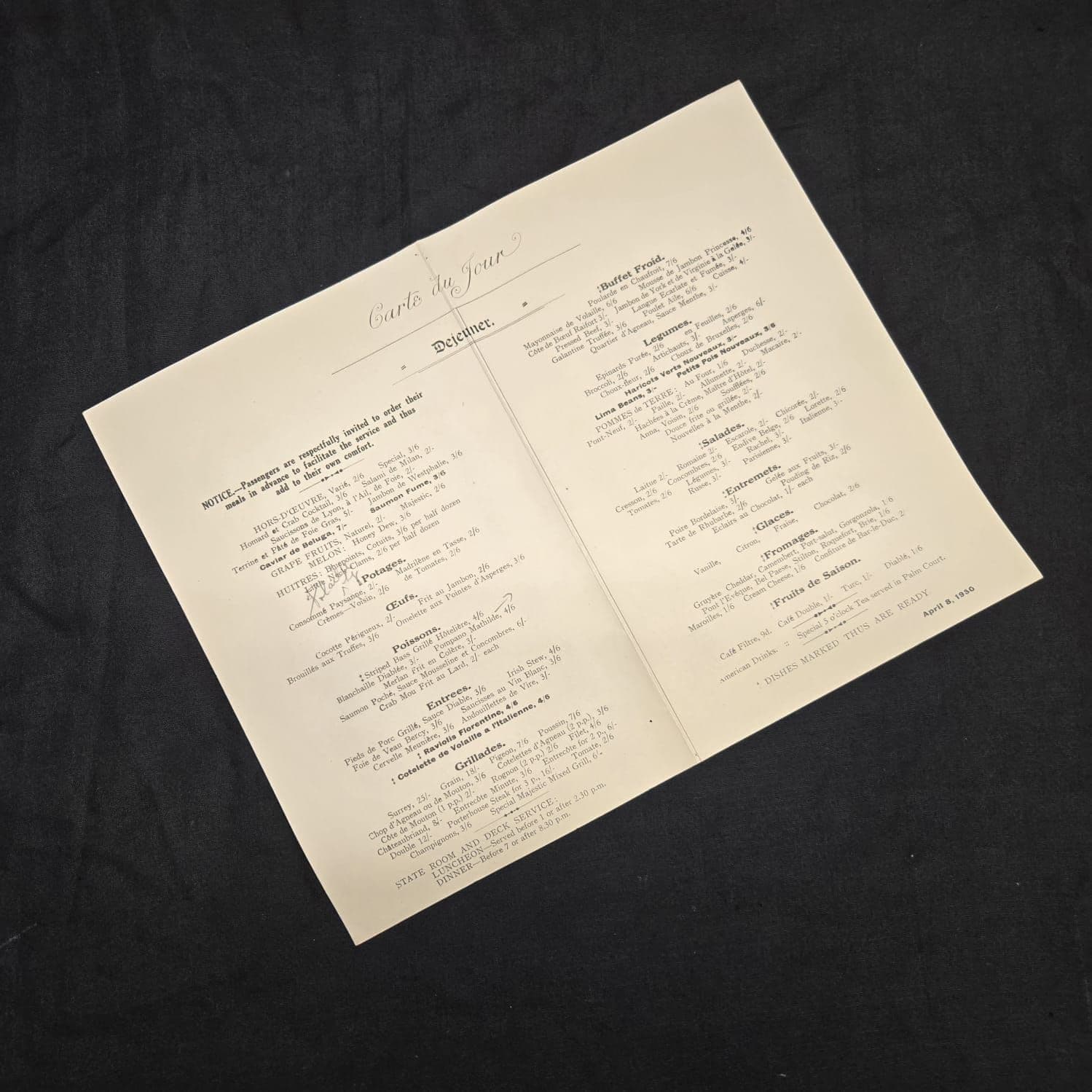 This is a rare à la carte menu, dated 8th April 1930 is for breakfast from the White Star Line's flagship, RMS Majestic; largest vessel in the world during the 1920's & 30's, until the arrival of Queen Mary in 1936.