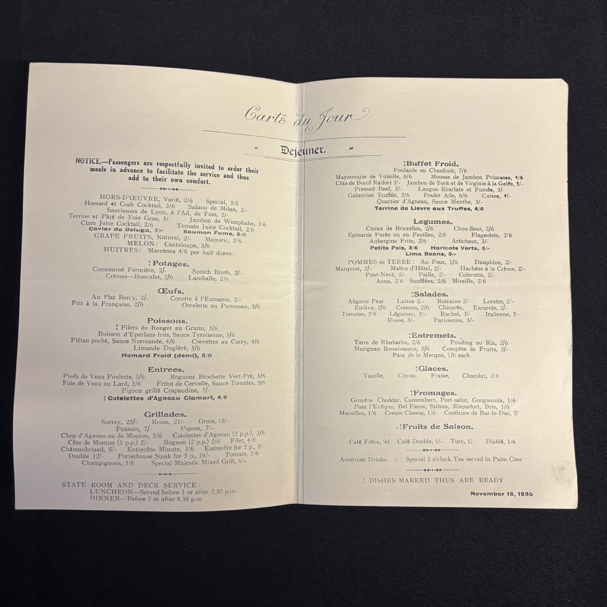 RMS MAJESTIC, A LA Carte dinner menu