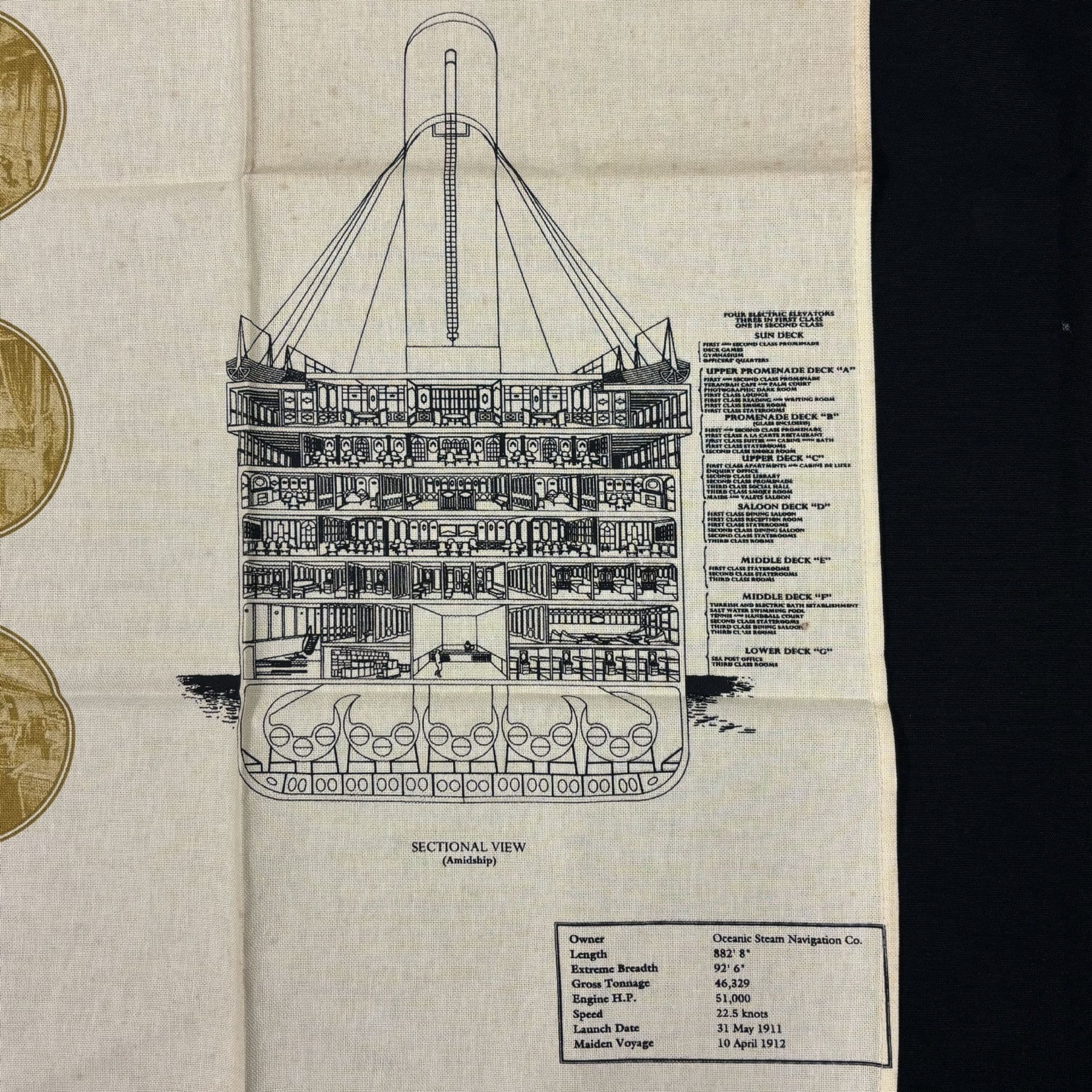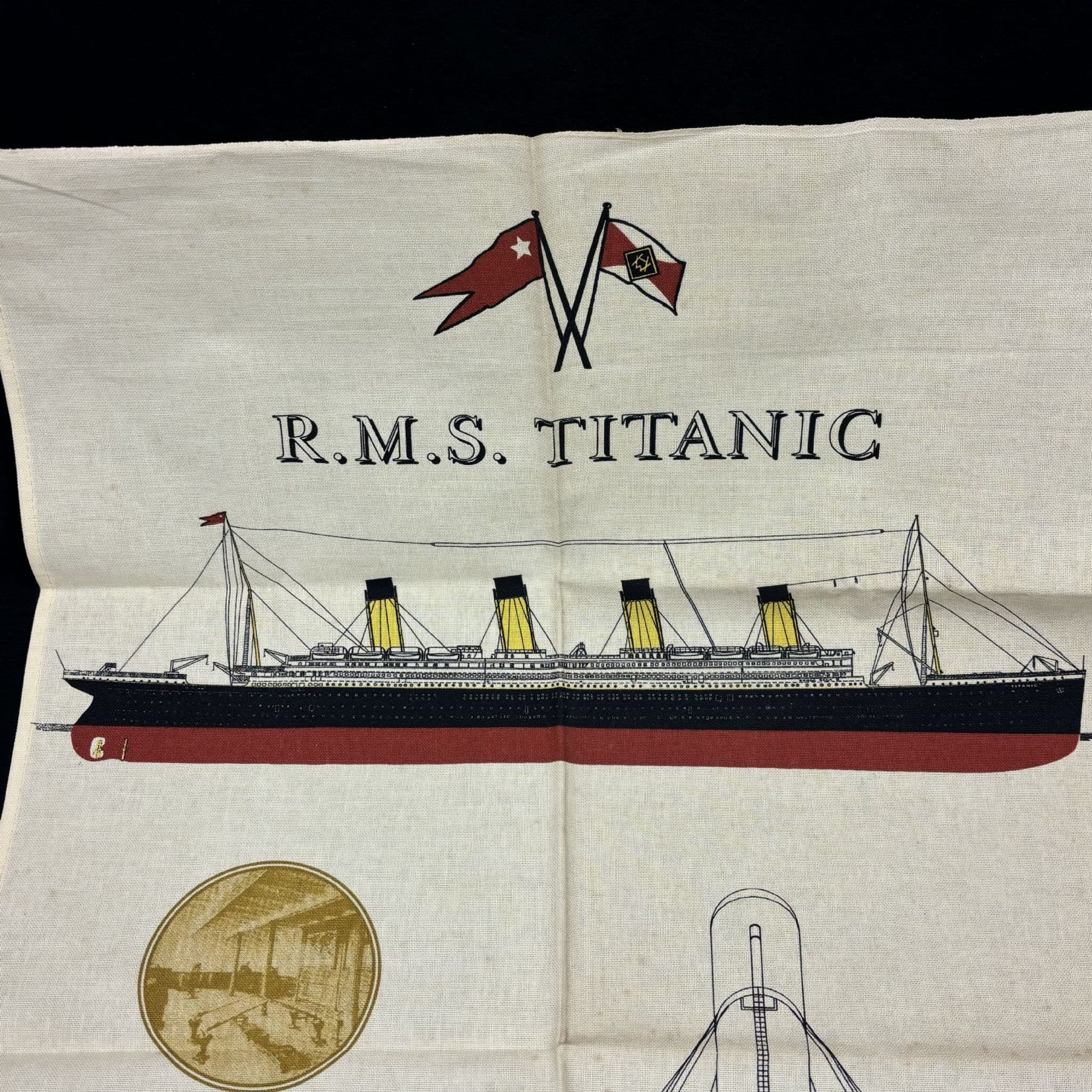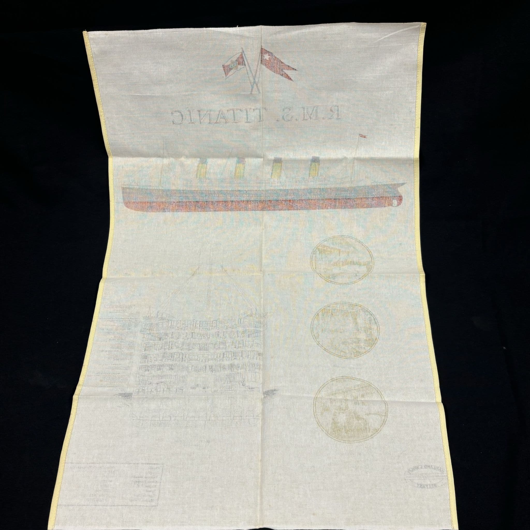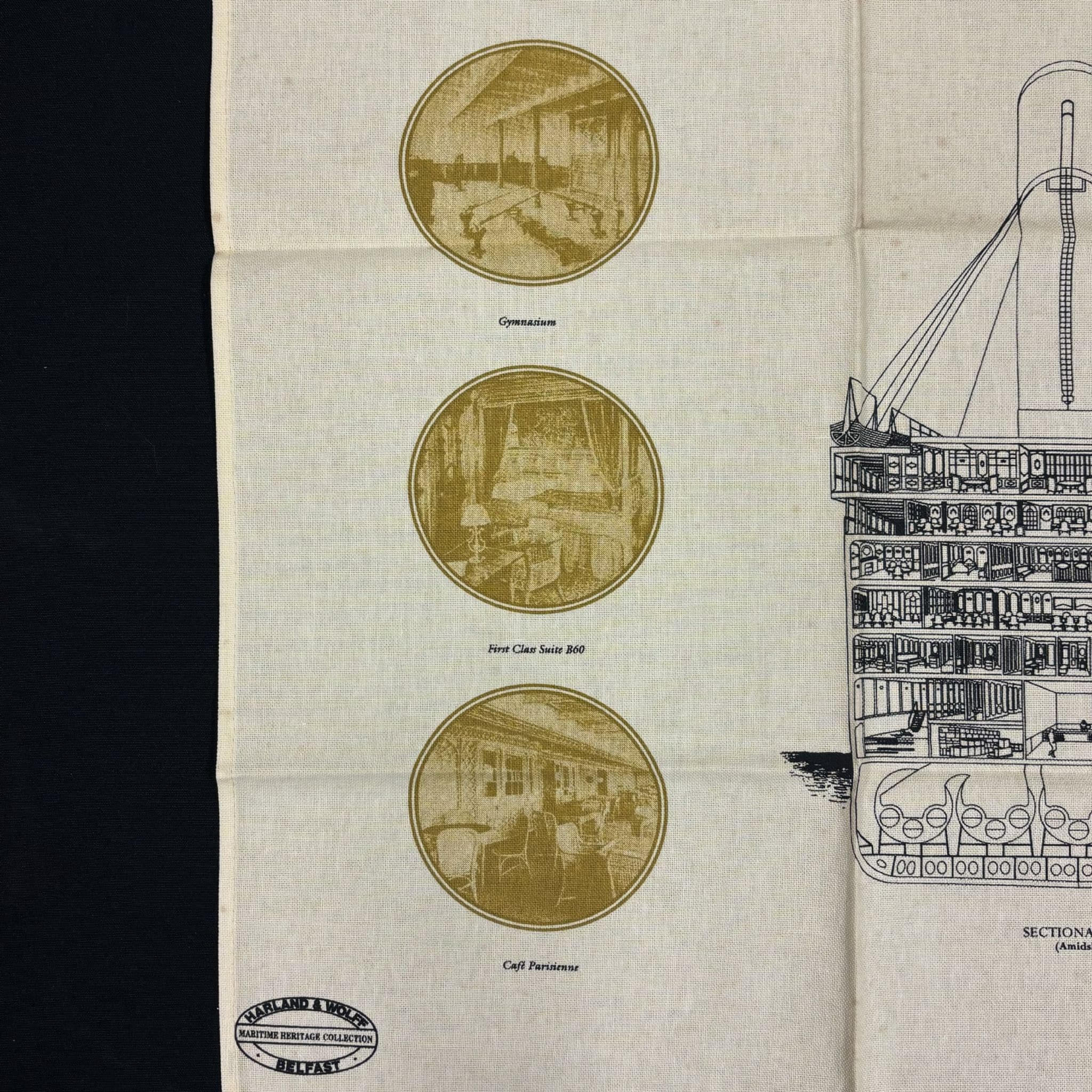 This is a greatly designed Titanic-themed tea towel, showcasing detailed and historical illustrations.
