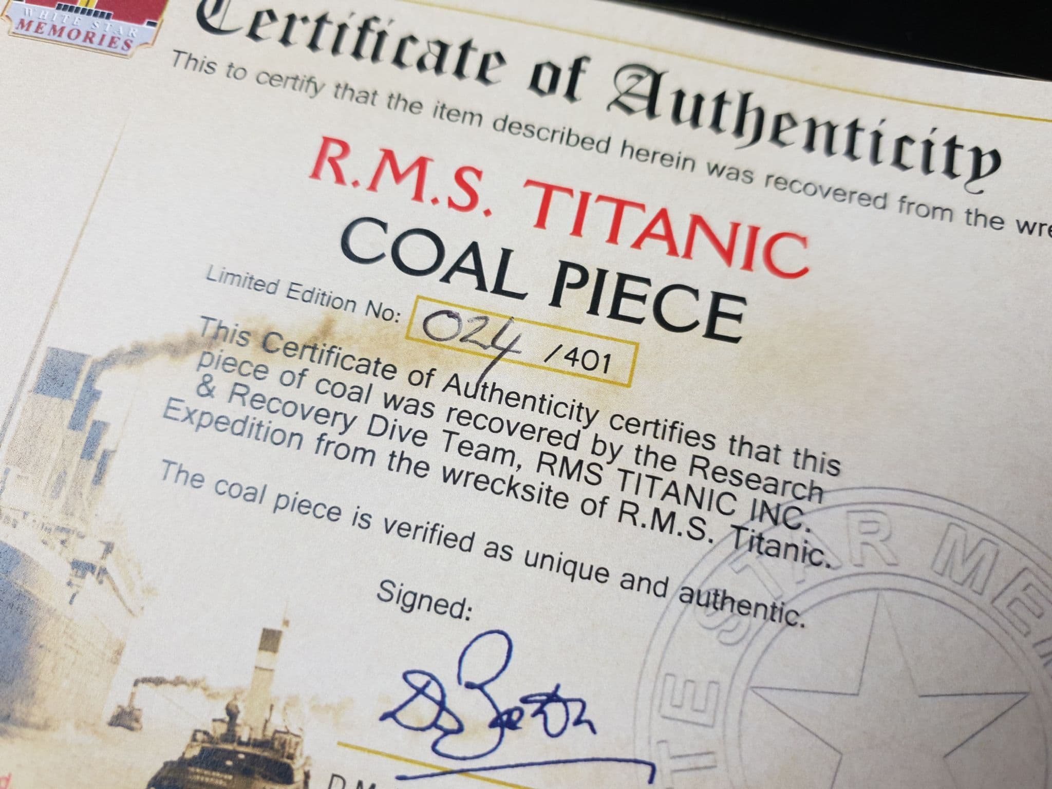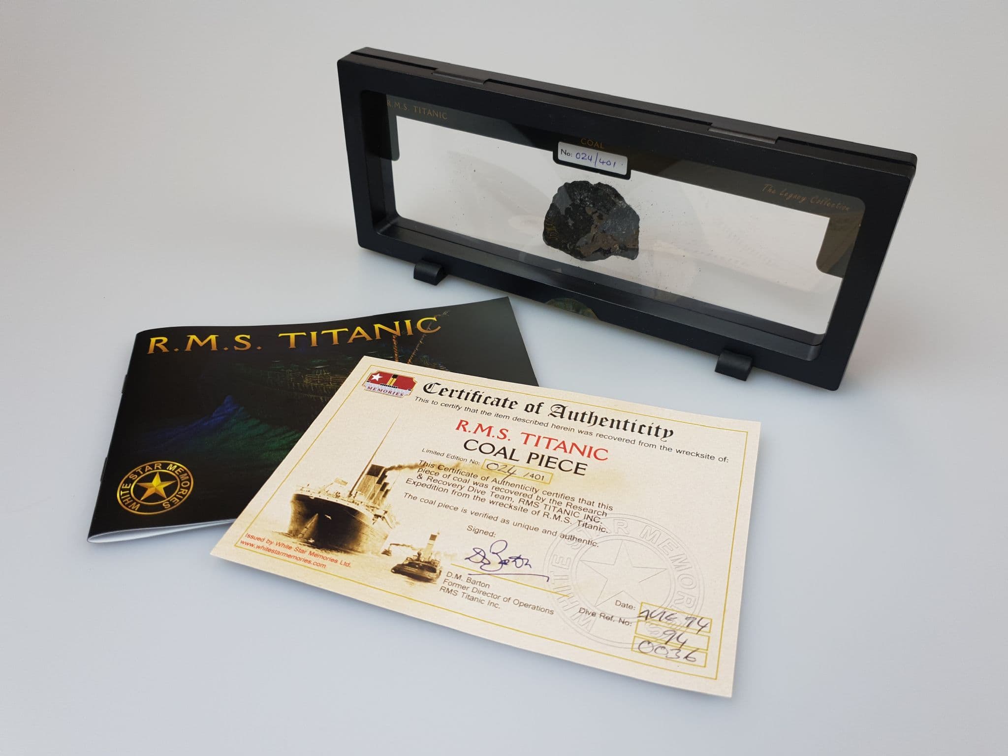 These are not small fragments, as previously offered elsewhere for sale. Each piece of coal is substantial and approx. half the size of a golf ball. The coal is presented in a sealed display frame that comes in a specially-designed, beautiful presentation box, complete with a full colour descriptive booklet and Certificate of Authenticity, signed by expedition leader and former vice-president of RMS Titanic Inc., Dik Barton, who has dived the wreck of Titanic 22 times!
