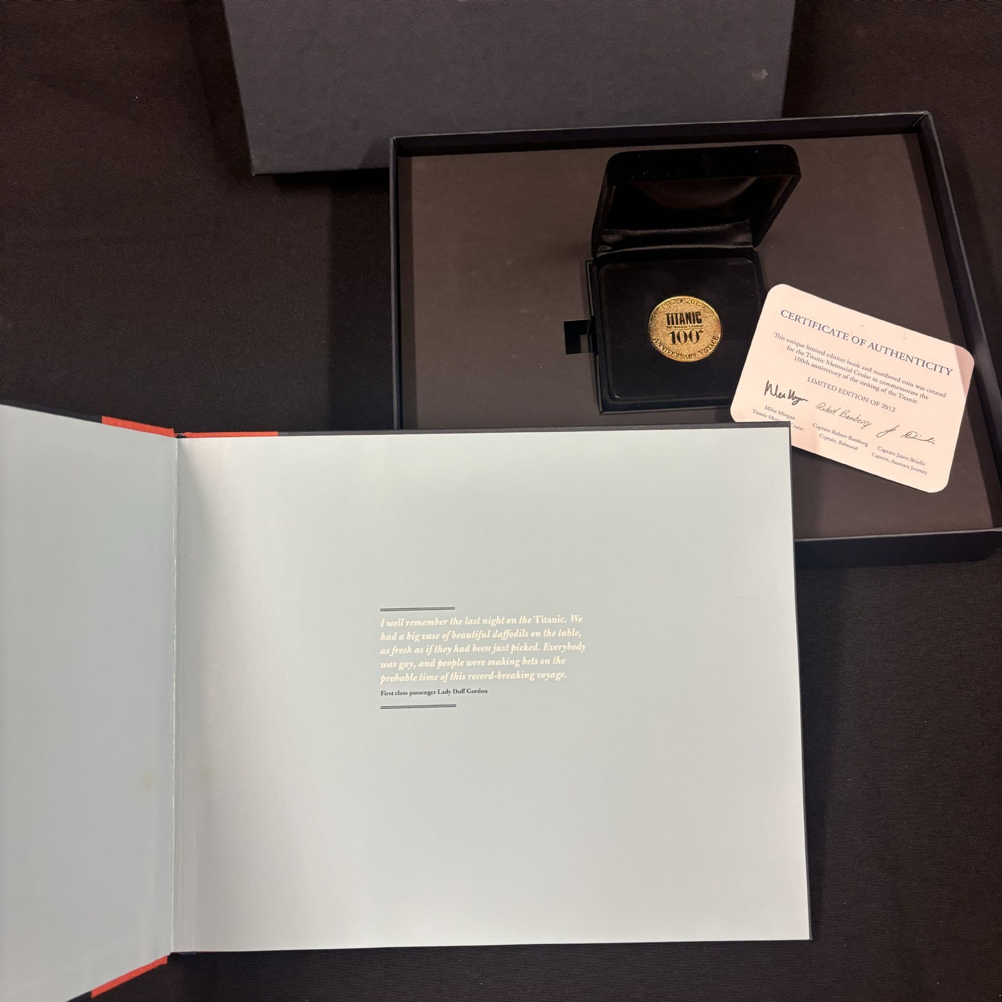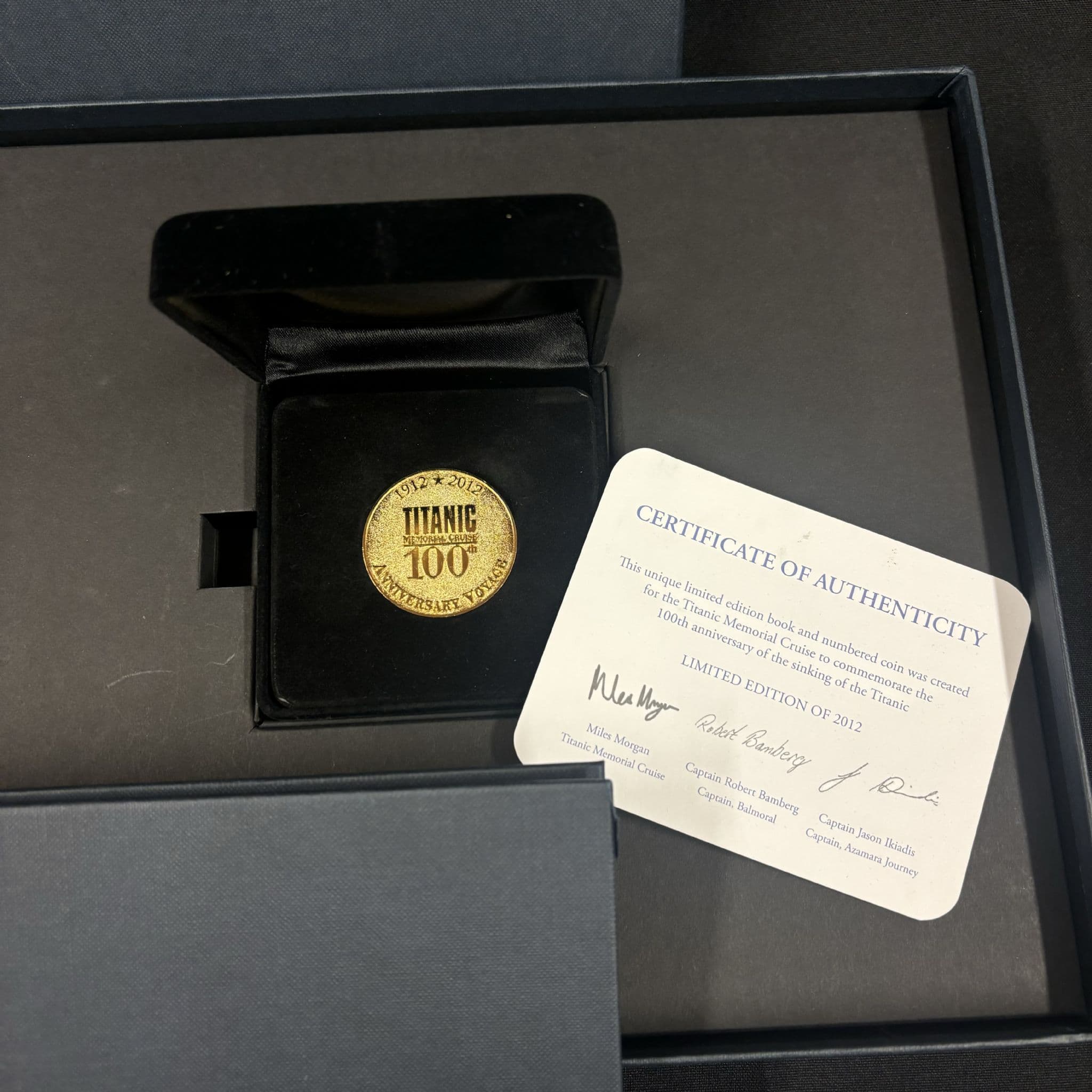 Inside, includes a black display case holding a commemorative coin, accompanied by the certificate of authenticity. These coins were created specifically for the Titanic Memorial Cruise. Limited Edition of 2012.
