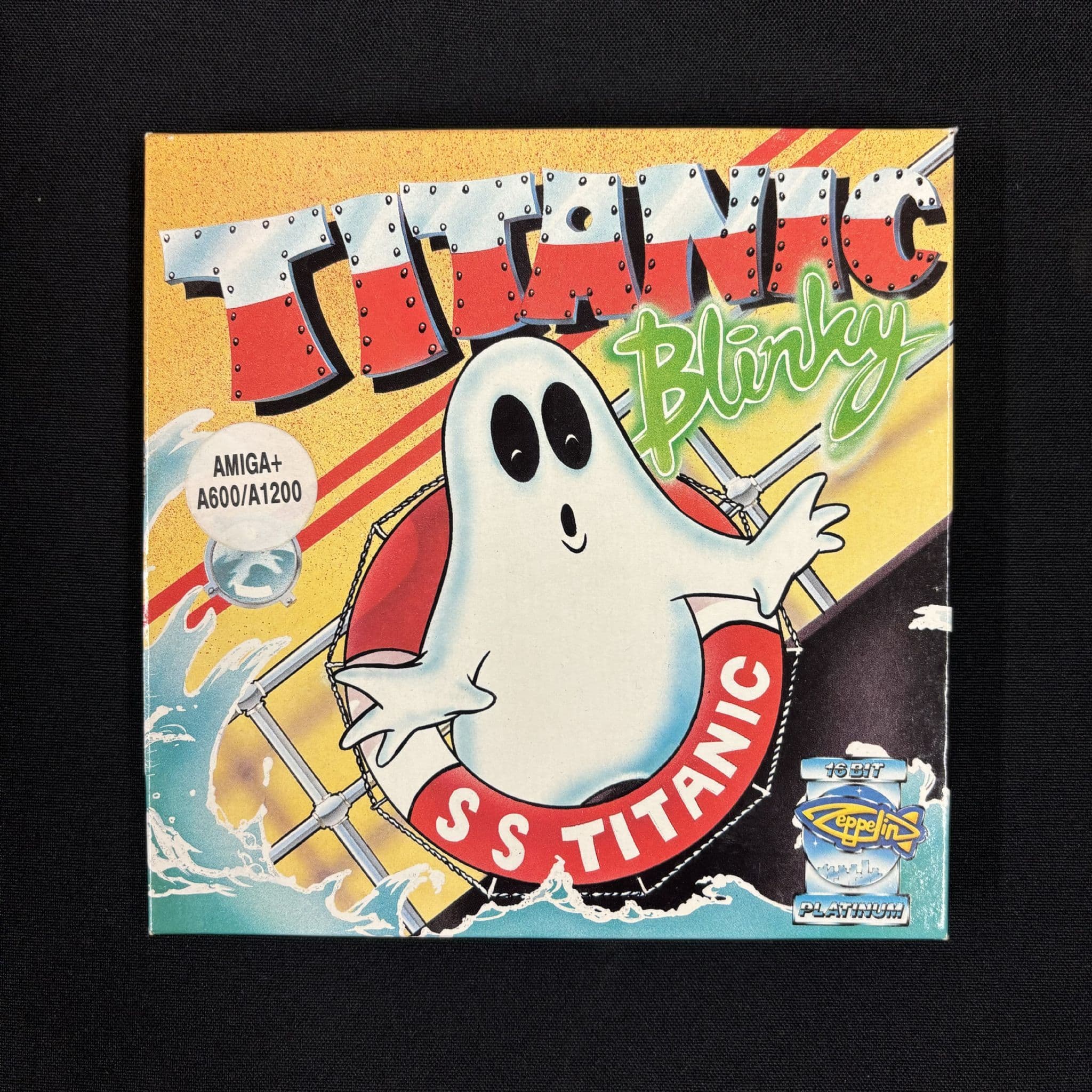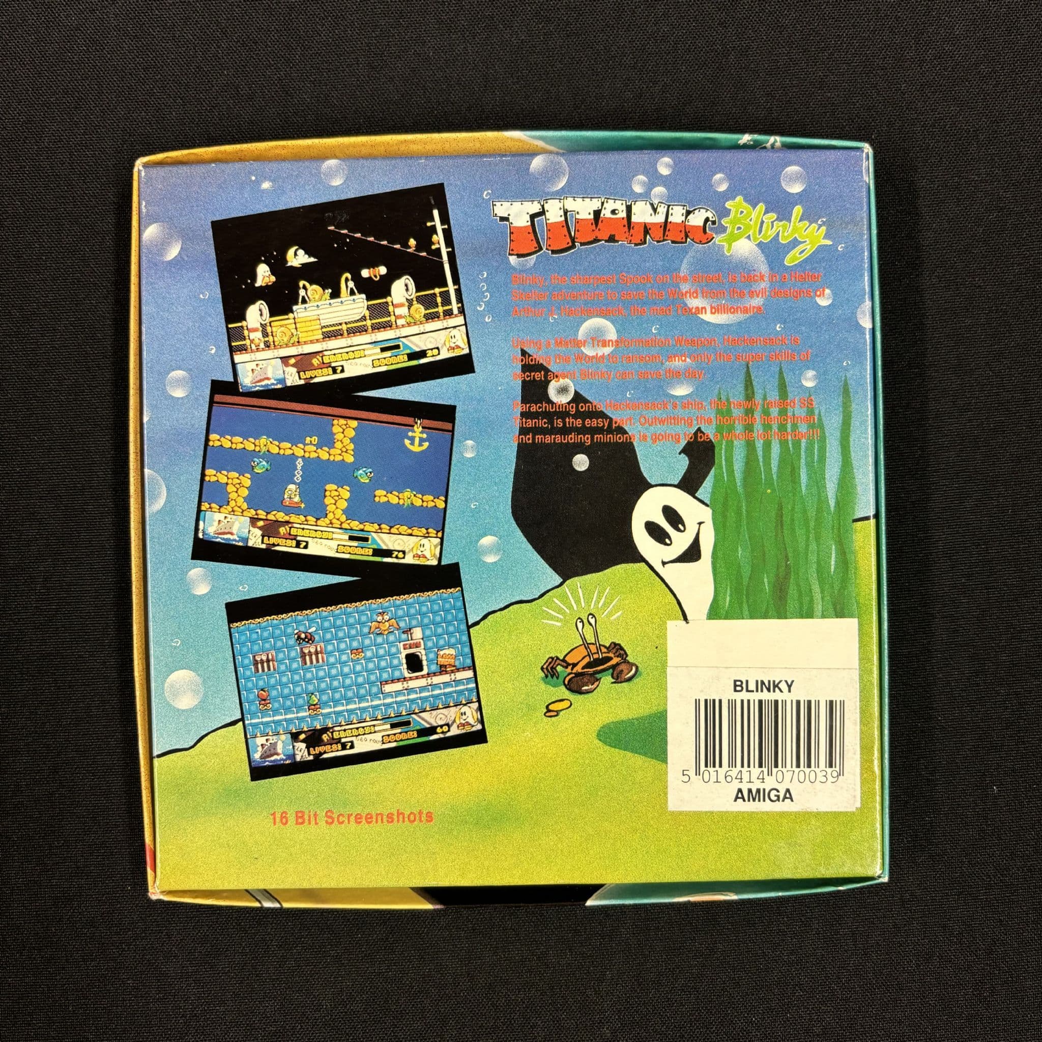 This is a vintage computer game package for the Amiga system from 1991. It features a floppy disk and cover artwork for the game "Titanic Blinky."
