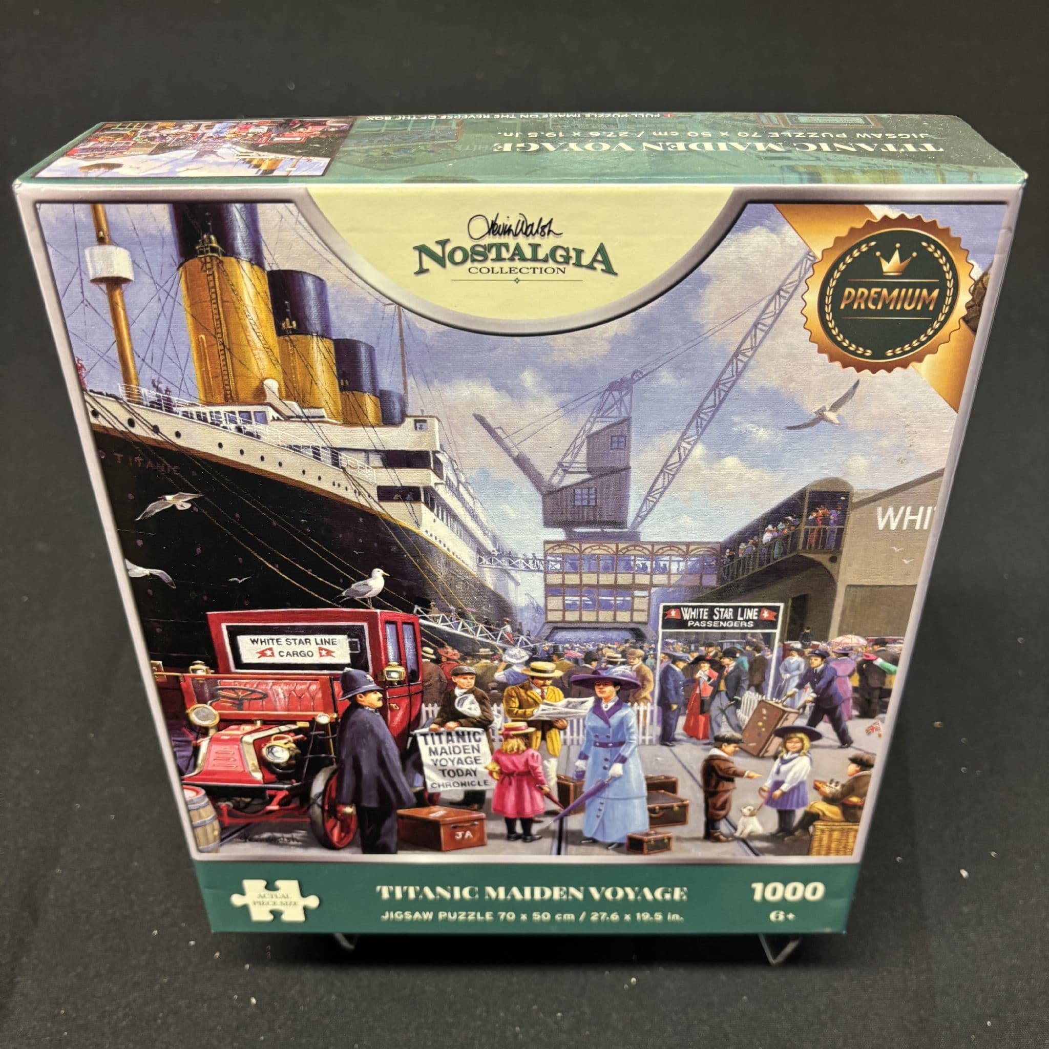 Step back in time with this beautifully illustrated puzzle by Kevin Walsh, capturing the RMS Titanic at port on the day of her maiden voyage. Part of the Nostalgia Collection, this 1000-piece puzzle offers a richly detailed scene filled with vintage charmpassengers, crew, cranes, and classic cars all set against the backdrop of the legendary liner.