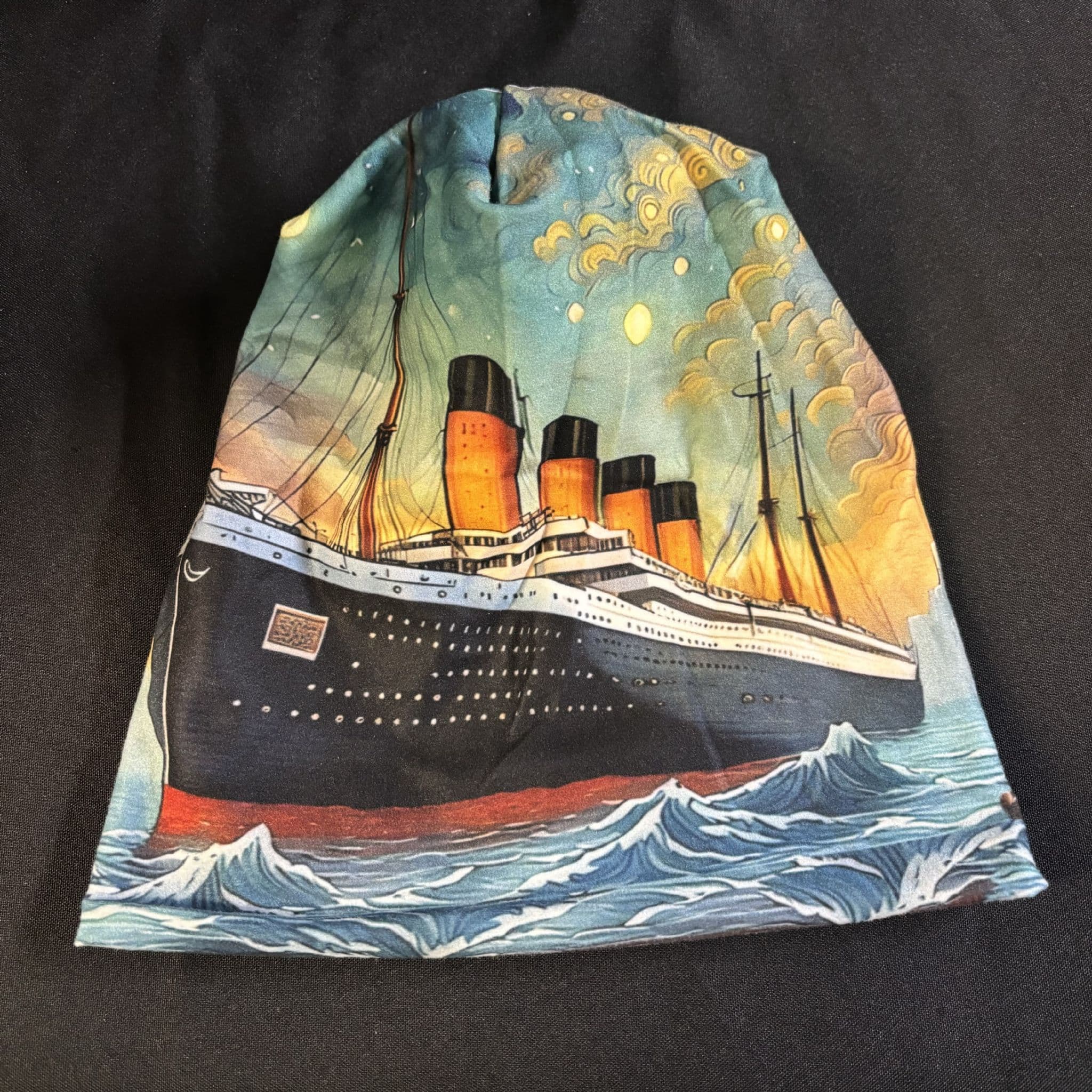 This is a stylish and colourful beanie hat with a bright Titanic on the front of the hat. The design is throughout the beanie and is printed on the inside too.